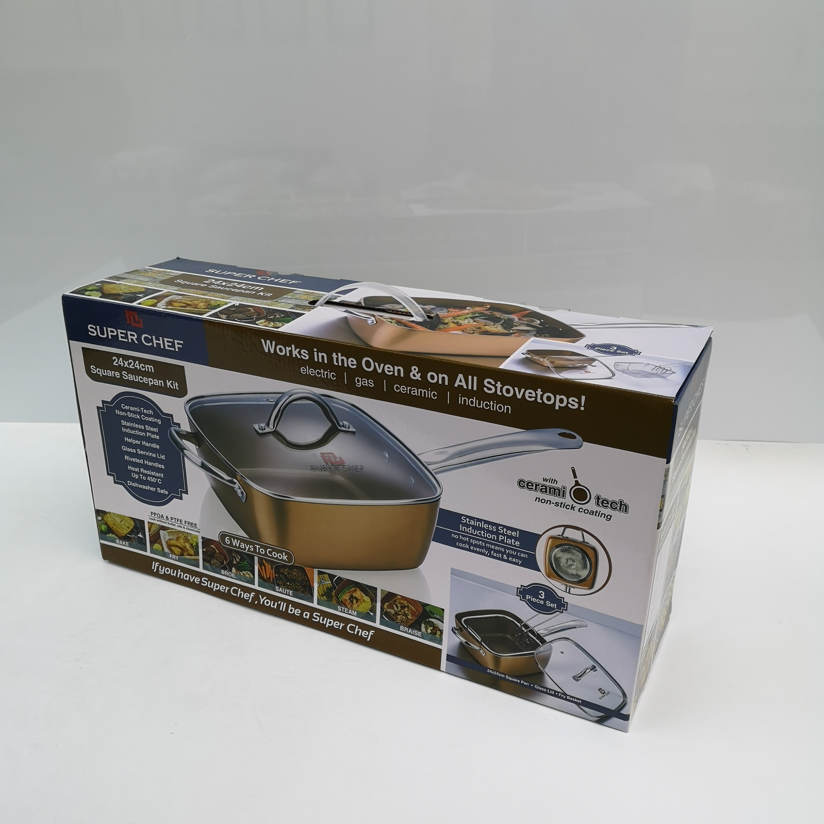Quánh Super Chef với thiết kế mới lạ hình vuông rất hiện đại bên cạnh vẻ ngoài màu vàng đồng làm tôn thêm vẻ sang trọng cho căn bếp. Bên cạnh đó, tay cầm được làm bằng inox rỗng tán đinh vào thân rất chắc chắn và hạn chế dẫn nhiệt làm nóng tay cầm. Đi kèm với quánh là nắp kính làm bằng kính cường lực được bọc viền bằng inox rất chắc chắn và sang trọng, giúp vừa giữ nhiệt, chế biến các món hấp rất tiện lợi và người nấu còn có thể dễ dàng theo dõi thức ăn trong quánh khi nấu. Ngoài ra bộ Quánh rổ Super Chef còn đi kèm theo 1 rổ inox với tay cầm dài chắc chắn rất thích hợp với các món chiên ngập dầu cũng như món luộc có thể vớt rất dễ dàng, không chỉ rổ còn có các khớp gài để treo rổ trên quánh chờ ráo dầu hoặc nước sau khi chiên hoặc luộc, nên rất tiện lợi.